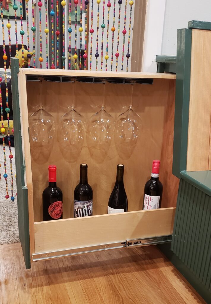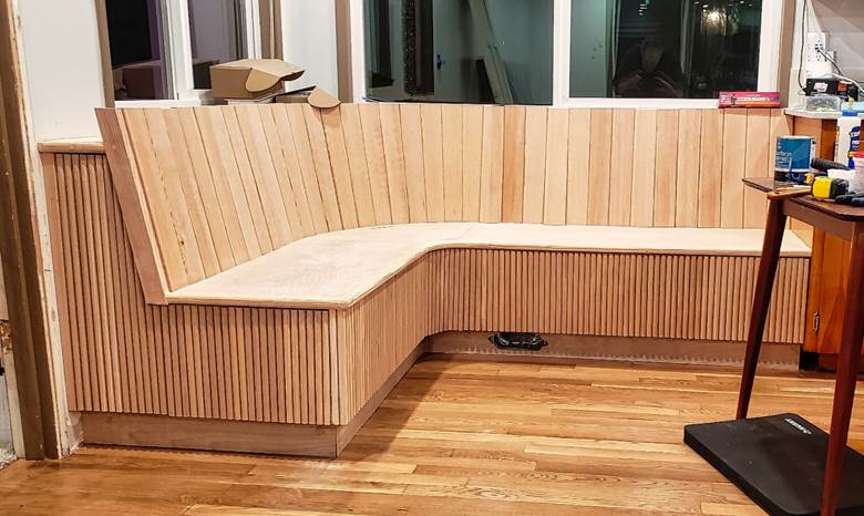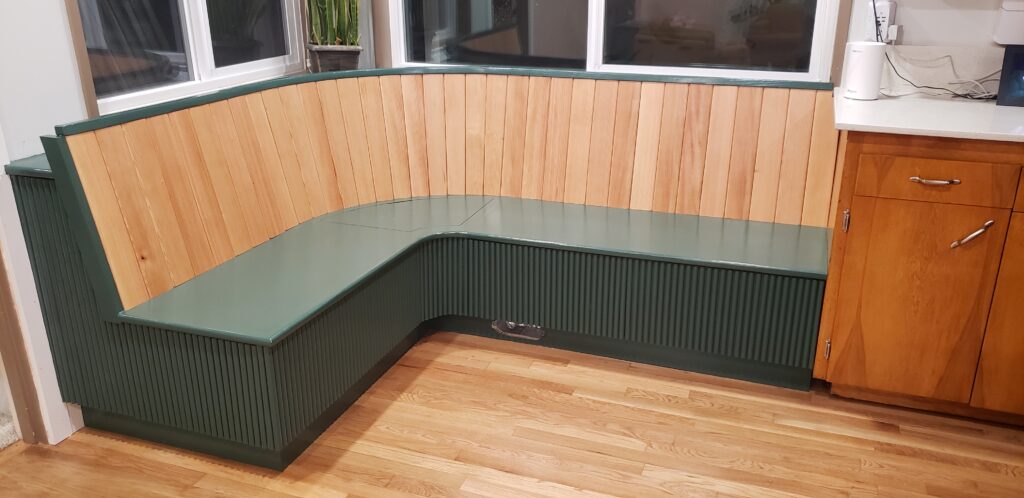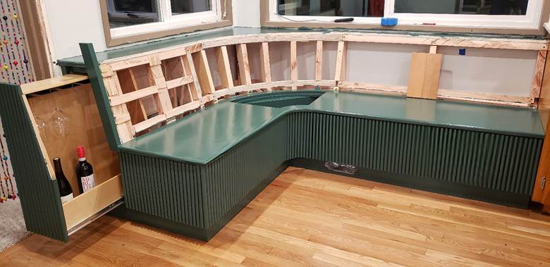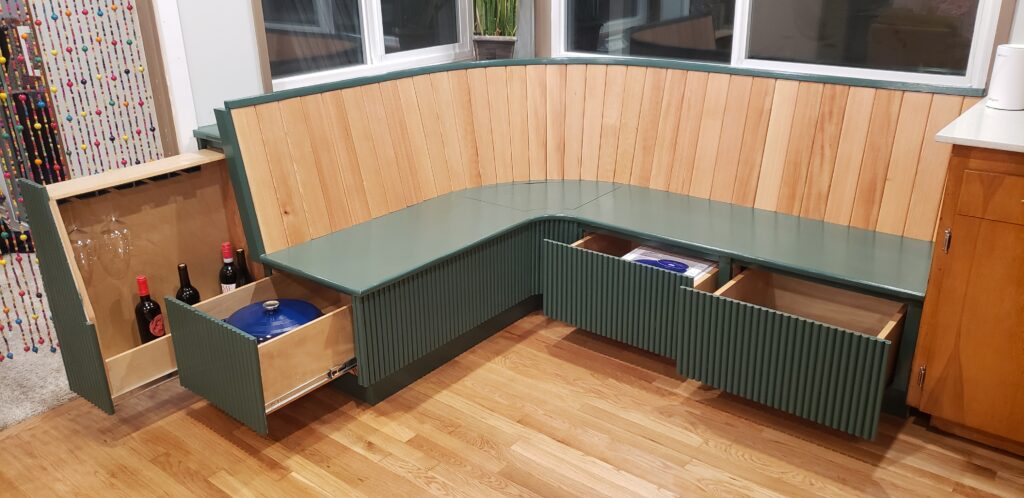 The second problem was that I added 8″ to accommodate the pull-out bar), but I also added 8″ to the opposite side as well (to keep it symmetrical). This not only wasted space, but also made the banquette extend past the kitchen cabinets