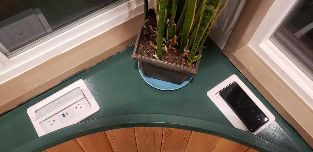 One cool feature is that I installed two pop-up outlets on the back of the banquette that also double as wireless phone chargers.