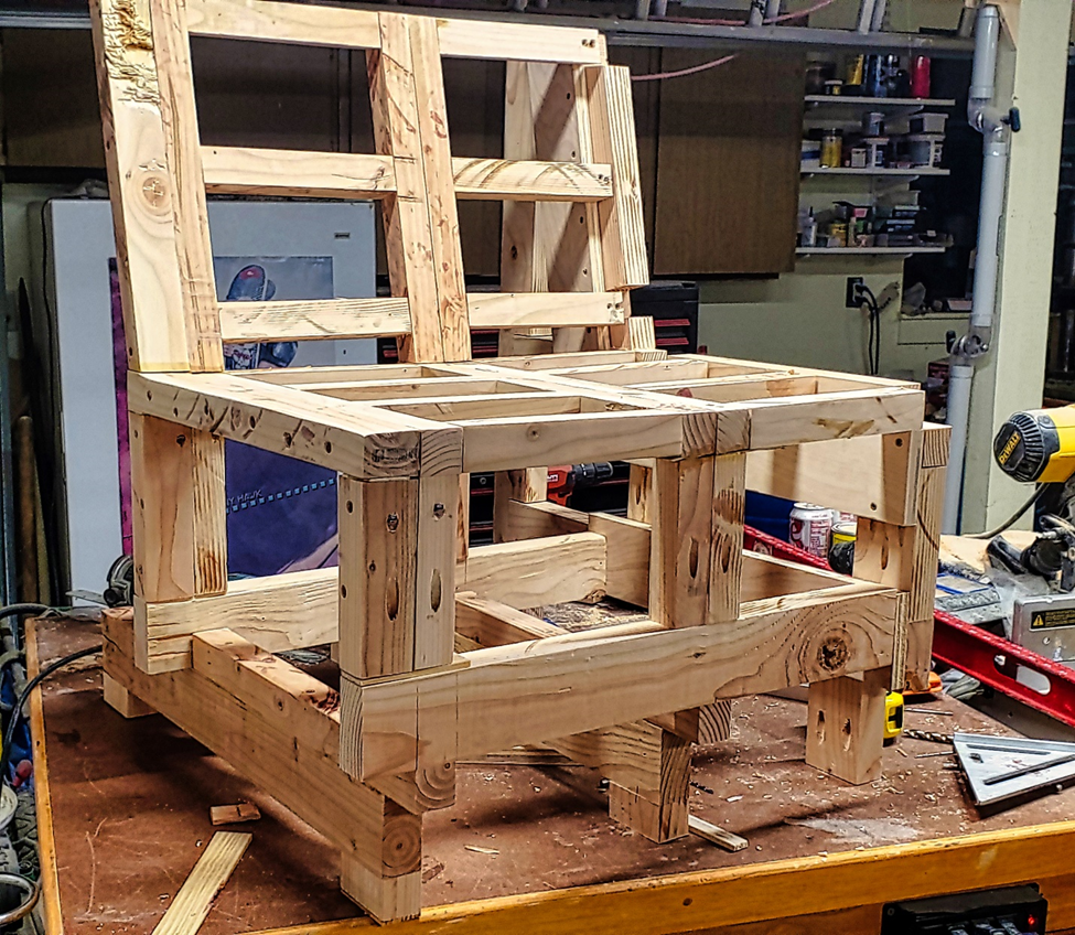 I love a challenge, so I agreed (which forced me to change my above template). She then thought that it would be great if the seat portion also had a drawer that slid out of the side (rather than from the front). This forced me to rethink the support system (and to add a little steel to the construction), but I started on the end with the side drawers and built this: