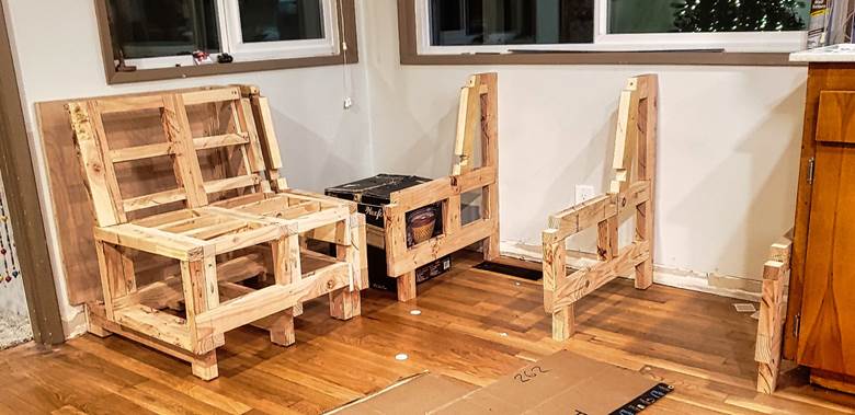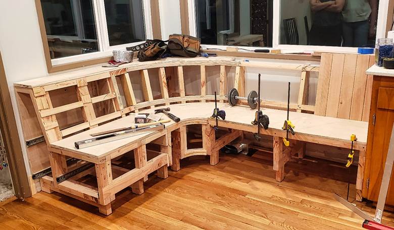 My daughter’s (and her new husband’s) house has a breakfast nook, and my sister-in-law (who has an amazing eye for decorating) suggested that I build a banquette for it. Within a week of finishing the pantry, I started designing and building it. I had no written plans and they weren’t certain what they wanted, but I figured that a basic L shape would fit nicely and that I could include drawers for storage. They also agreed that we could paint it, which means that I could use wood filler to make up for lack of woodworking skills.